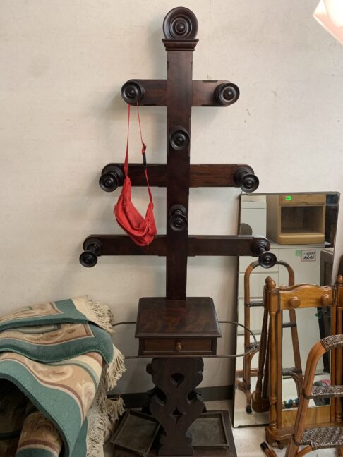 面白い形の民芸家具をお譲りいただきました。たくさんカバンやコートや帽子などを掛けられそうです。初めて見る家具です。とても高価そう。