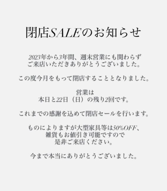 最終営業日は2月22日(日)13時から19時です!