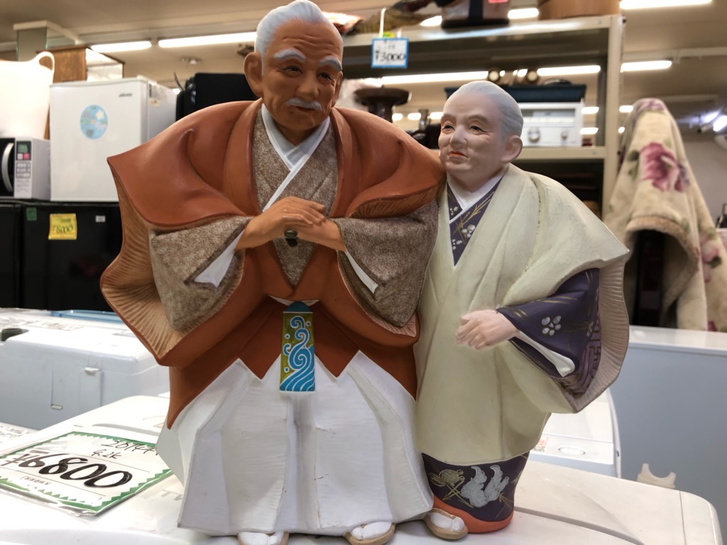 今日、店番をしている時に、あった話ですが、またまた外国からの観光客が来店されました。3人グループでその内の一人が侍Tシャツを来ていて、見てすぐにこの人侍が好きなんだなと一目で分かりました。外国の方からの一番の人気と言えばやはり着物です。店内に入るなり、着物を選び三人で着物を試着して、選んでいました。当店の着物は羽織は何でも500円で売っているので、お土産には大変人気があります。他にも帯もたくさんあり、3人ともテンションが上がり両手一杯に着物を持ってレジの方まで近づいてきました。その時です。侍Tシャツを着た一人がストップ!!と言いました。彼らは足を止め彼の方を振り返りました。すると彼の手には侍の置き物がしっかりと掴まれていました。満面の笑みで、お宝発見!まさに100万ドルの笑顔をされました、しかし何故か人形を見つめる彼の笑顔がだんだん時間が経つにつれ90万ドルの笑顔70万ドルの笑顔とだんだん笑顔が崩れていったのです。このままじゃ駄目だと、とっさに思い20万ドルの笑顔になるぐらいの所で僕はすかさずwhat happned?どうしたの?と聞きました。すると彼はCan.t get it? これ!とれへんのか!?と僕に聞いて来たのです。僕はすかさず人形を手に取り人形を引っぱりCan not! 取れません!と伝えました。侍Tシャツの彼はガッカリしながら、着物を買って帰りました。彼は侍単体の人形が欲しかったのでしょうね。その後同じ事が起きないように、値札に英語でCant takeと書いておこうと人形を何気なく見たのですが、引っ付いていると言うか、完全におばあさんの方ですが、侍の方にめり込んでます。何故このような形の物が作られたのかは謎ですが、見てたらだんだん面白くなってきます。面白い物のオンパレードの店内を是非見に来て下さい!よろしくお願いします!